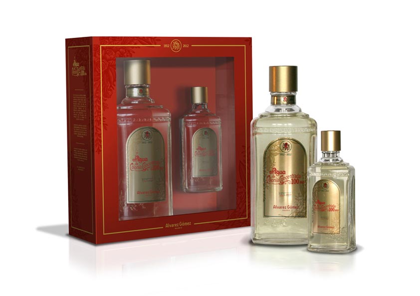 Ahora, cuando se cumplen 100 años de su aniversario, la fragancia original del Agua de Colonia Concentrada Alvarez Gómez se viste de gala para celebrar con sus fieles consumidores la fidelidad que han venido demostrando a lo largo de toda la centuria y agradecer a aquéllos que a lo largo de estos años han utilizado alguna vez este Agua de Colonia, pasando así a formar parte de su historia. Para ello se ha creado una edición especial que presenta un frasco inédito de 300 ml. similar en sus formas al frasco tradicional, al que se le ha añadido unas pinceladas de diseño Art Decó mediante relieves que hacen alusión a la historia de la fragancia, grabados en el vidrio. Entre ellos, destaca el sello Alvarez Gómez Madrid, que mantiene el grafismo-icono del león abrazando las letras A y G, ambas también representadas en los productos de la firma. El oro del estuche, la etiqueta y el tapón destacan con el rojo del logotipo: Agua de Colonia Concentrada 100 años.