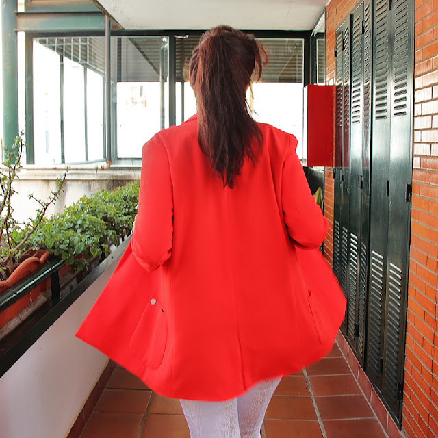 La americana es la pieza más llamativa por su color, de un rojo intenso rozando el coral. Larga hasta la cadera, tiene dos bolsillos laterales rematados cada uno con un motivo circular metálico. Sin botonadura ni cremallera, es una prenda para llevarla abierta, por lo que se puede observar que va forrada en negro. Tiene una caída suave, delicada, vaporosa…, ¡simplemente perfecta!
