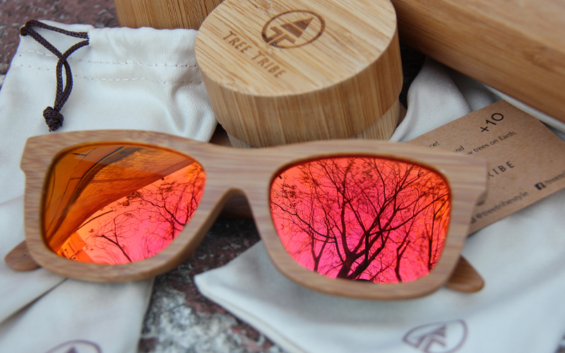Tree Tribe comercializa gafas de sol de madera y bambú y, de entre su oferta, me decidí por dos pares del mismo modelo (Original Floating Bamboos; Bambú flotante original) pero con distintos tonos de color en sus cristales: lente de espejo rosa y lente de espejo azul hielo.